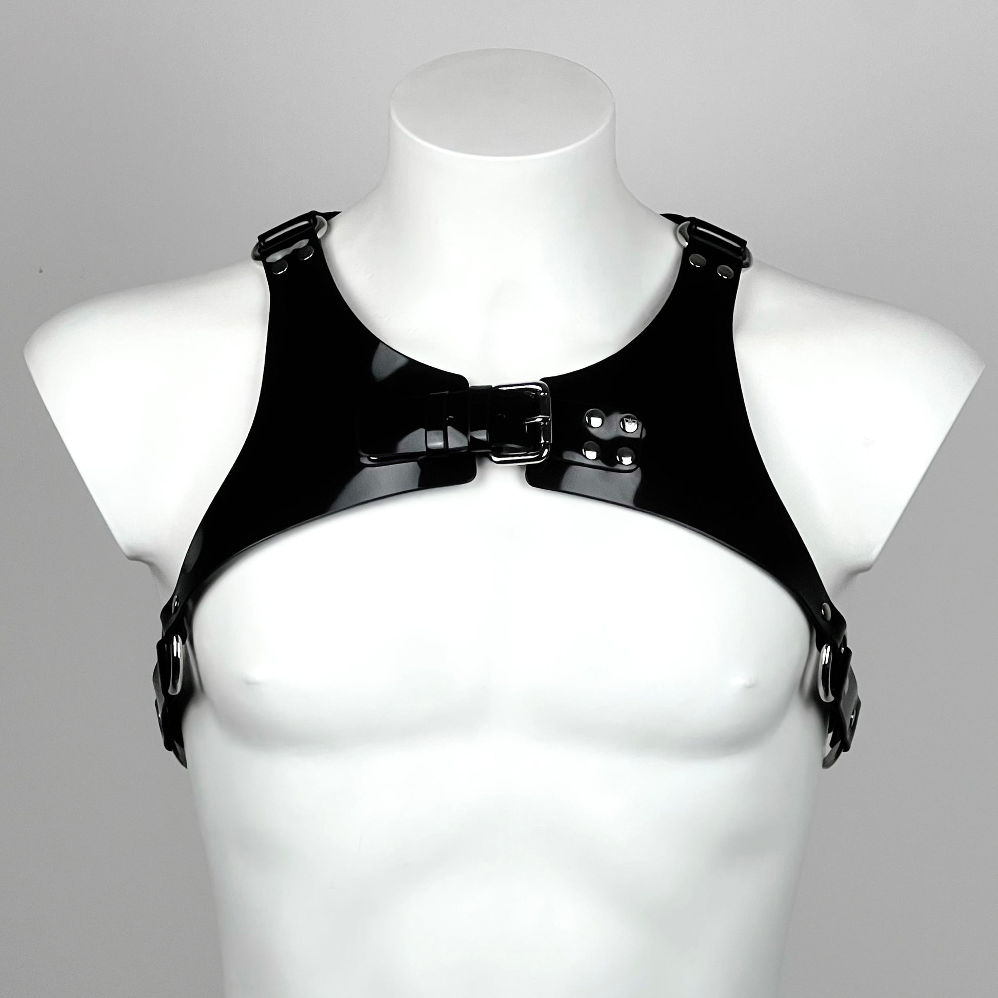 Our Soldier Harness is made from 4 cm PVC straps which are united by two silver metallic rings at the front of the bust with an adjustable buckle and it attaches and adjusts by four large buckles on the back. It features a large piece of PVC with a ring on the back and a D-rings detailing on the front giving to the harness an elaborate twist.