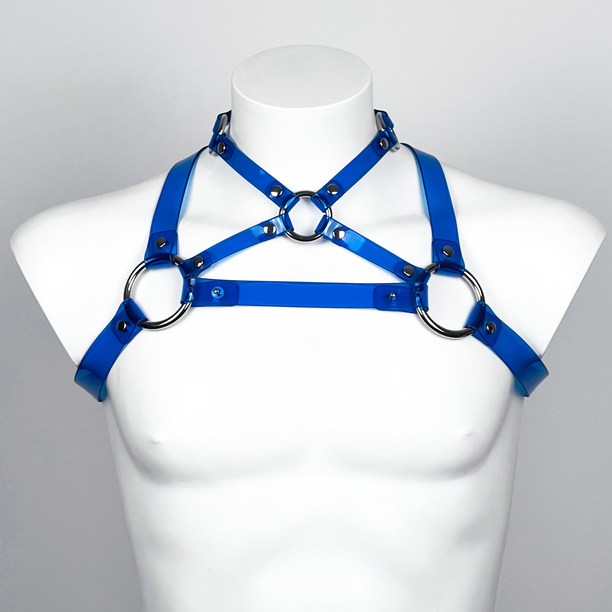 Notre harnais pour collier Bull est composé de sangles de 1,5 et 2,5 cm. Il possède trois anneaux à l'avant, un anneau à l'arrière et deux boucles argentées réglables situées sous les bras pour fermer et ajuster le harnais. Une sangle amovible est située à l'avant pour relier les anneaux latéraux et créer un équilibre.