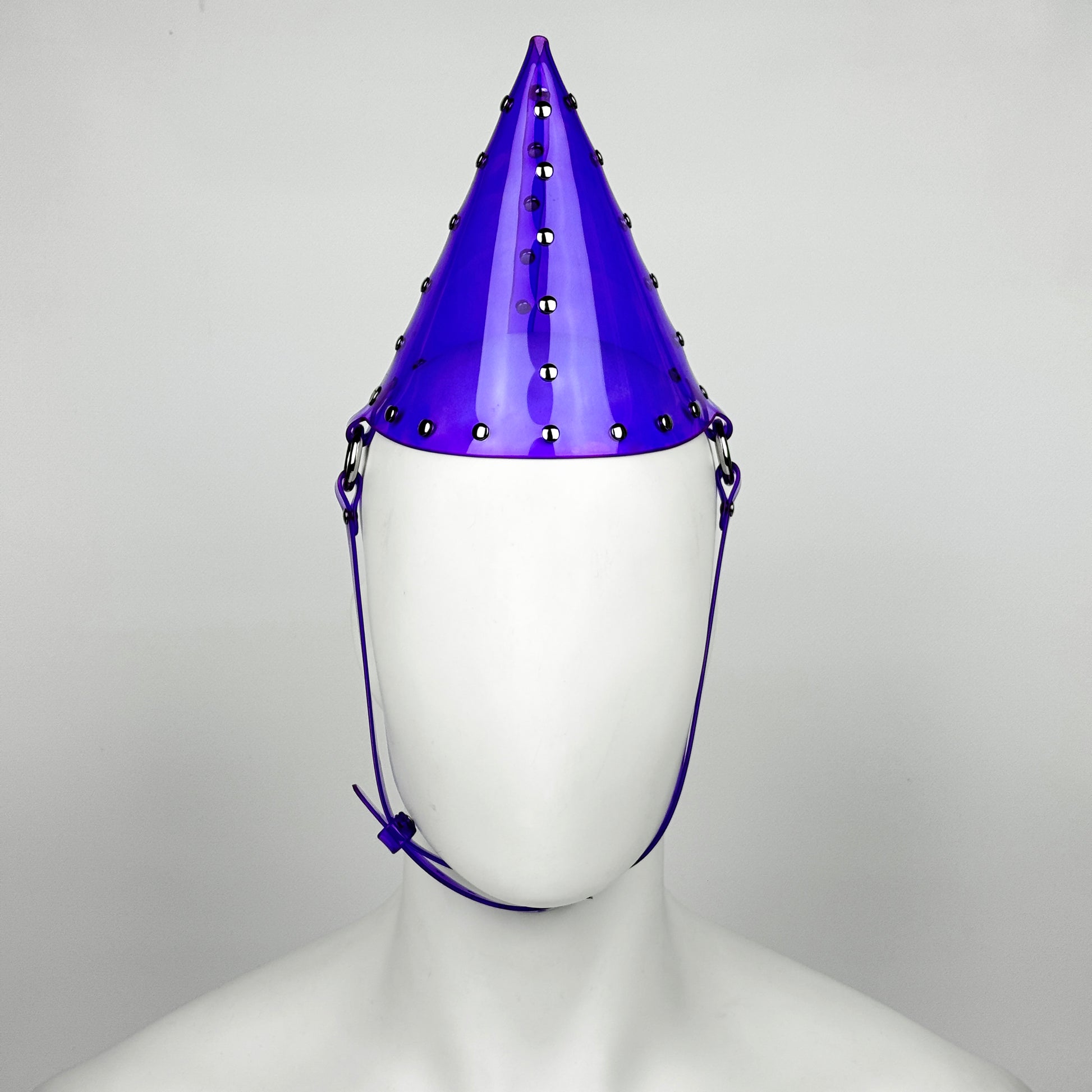 Our Bday hat is made from a large piece of PVC folded to create a cone as a hat. A strap is hold by two small rings in metallic silver, and it is adjustable by a silver metallic buckle. It is adorned by small rivets.