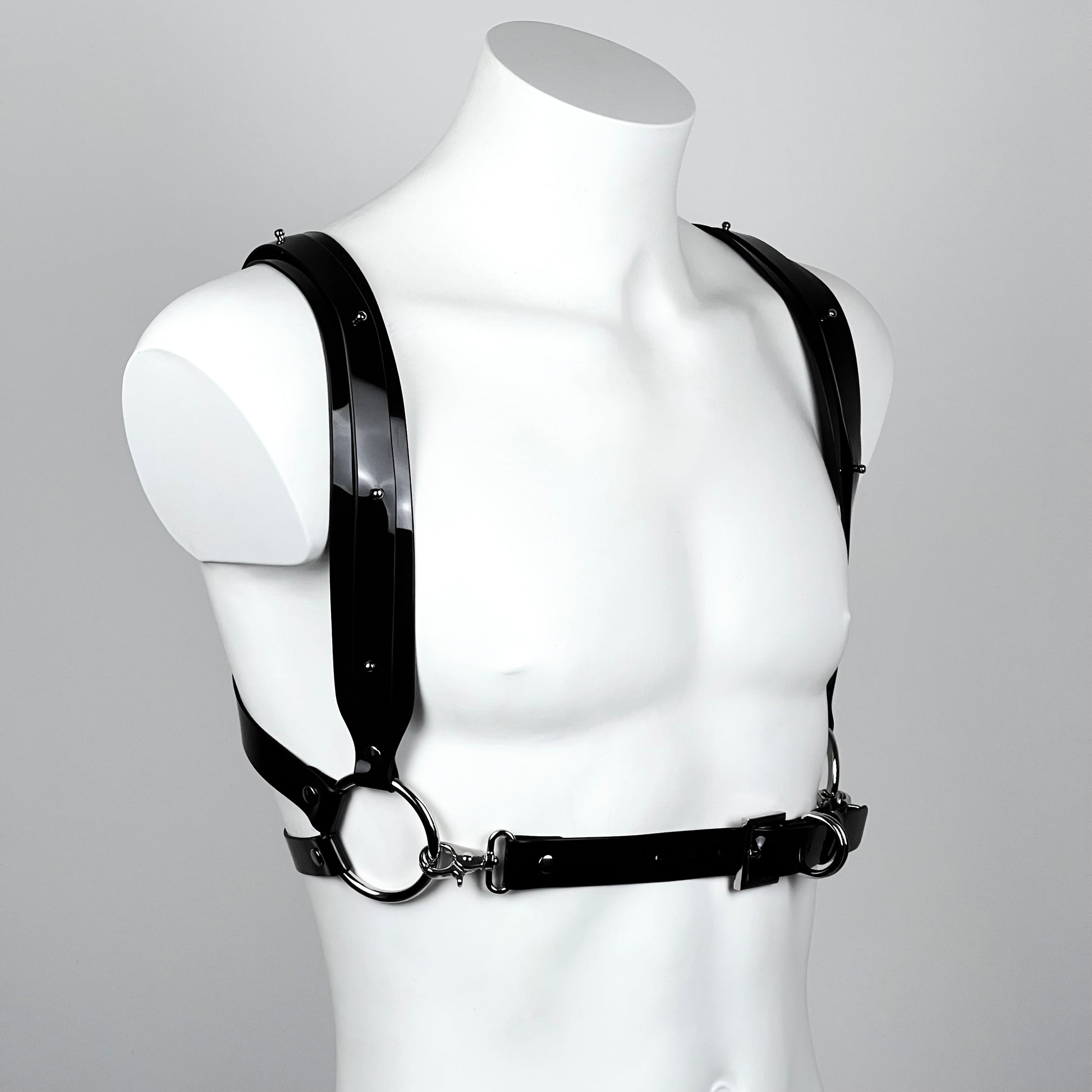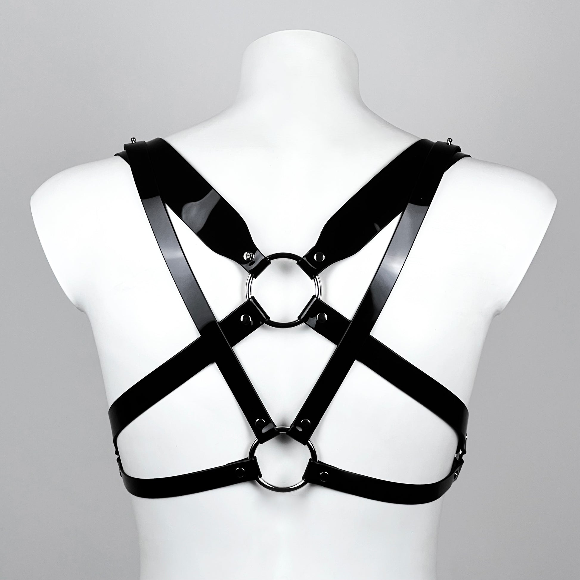 Our Berliner harness reshapes simple straps into a bold layered, cross-back construction anchored by two statement rings.