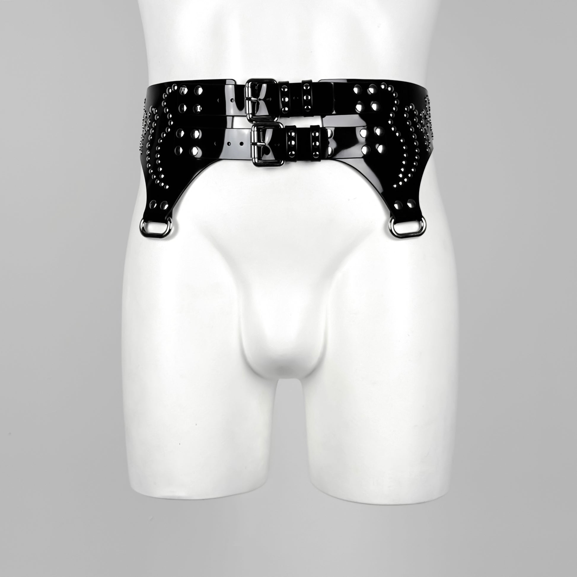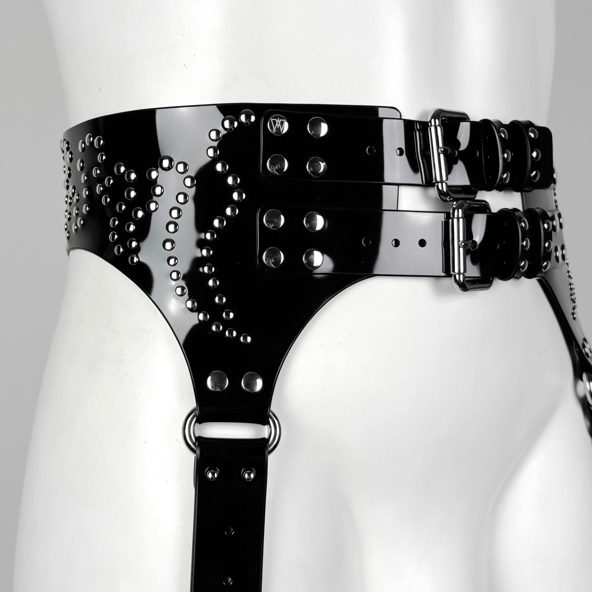 Our Freddy Flame Harness is a high-waisted bottom harness, crafted from PVC, built to define the waist and grip the thighs with precision. Flame-shaped studs spread across the surface, creating a sharp, heated texture that draws the eye and keeps it there.