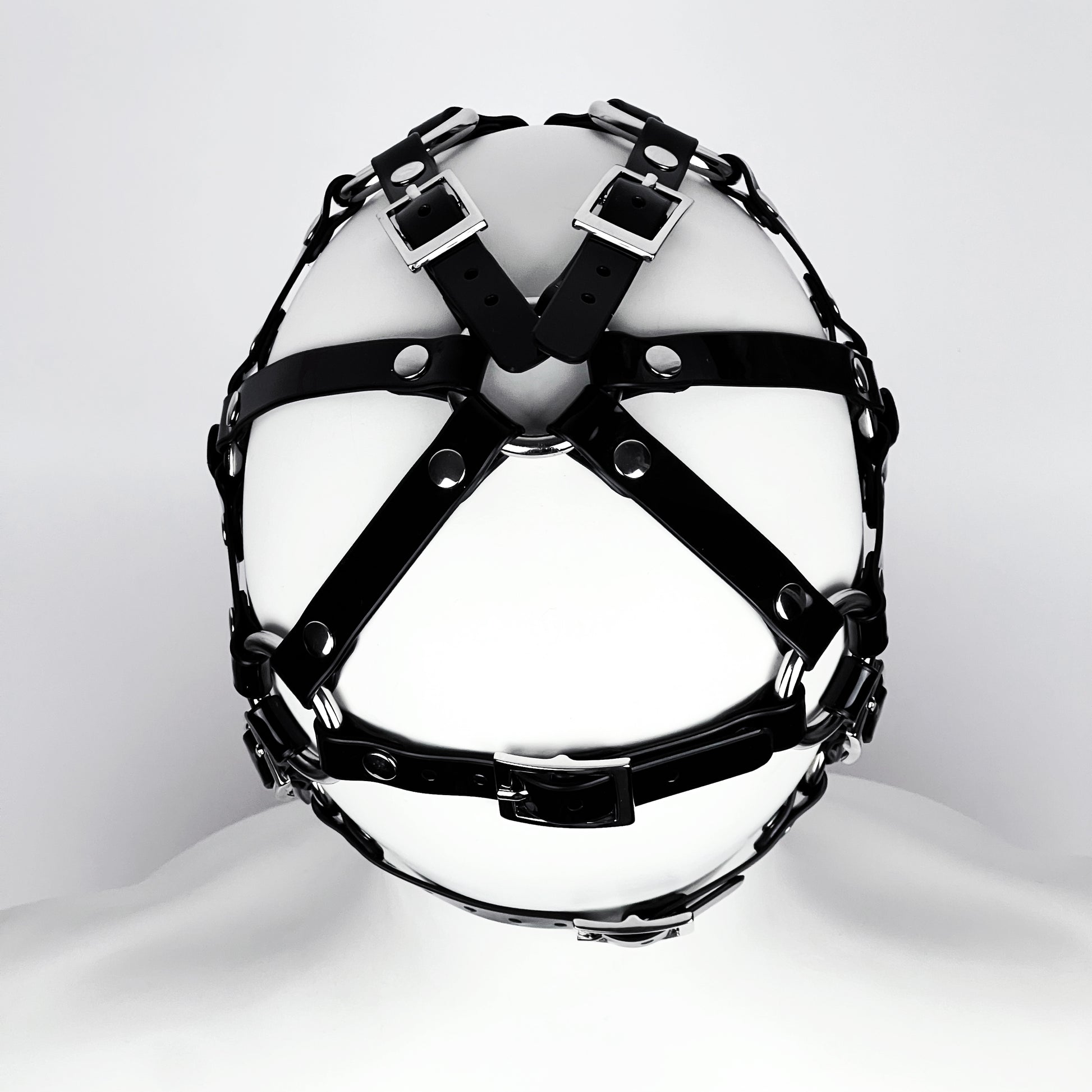 This striking head harness is built around a PVC muzzle plate, secured by a multi-point bondage strap system, fully adjustable with metallic buckles. Each strap adjusts to sculpt a tight, anatomical fit, while reinforced O-rings and hardware create a powerful statement of submission and avant-garde style.